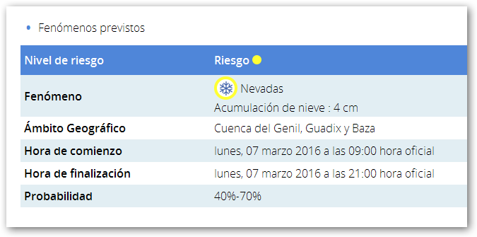 La AEMET ha activado el nivel de alerta amarillo por nieve en el ámbito geográfico de Guadix y Baza. La cota de nieve irá bajando durante el día de hoy, 7 de marzo, hasta situarse 1000m-1100m.