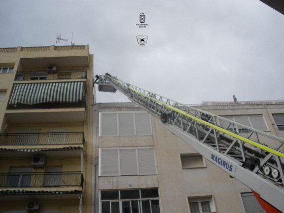 Esta mañana, una dotación de bomberos con el vehículo Escala han retirado algunas láminas de tela asfáltica del lateral de un bloque de pisos en la Plaza San Francisco de Baza, dado que el intenso viento las había arrancado y ponían en riesgo la seguridad de los viandantes.
