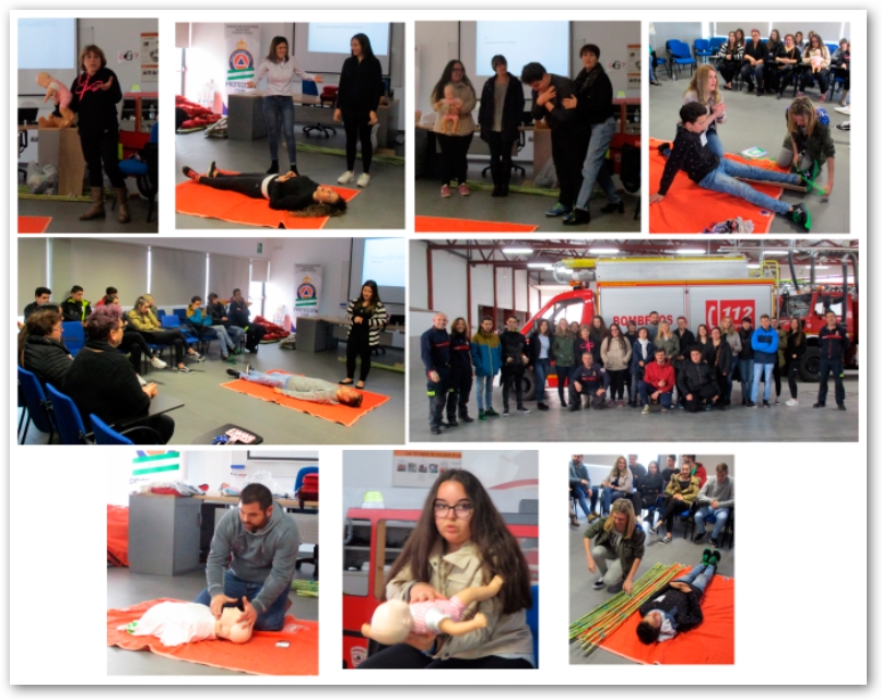 Una veintena de alumnos y alumnas del ciclo formativo de «Técnicos en Cuidados auxiliares de Enfermería» compartieron sus conocimientos en primeros auxilios, RCP, movilización e inmovilización y valoración del trauma, con el personal del Parque de bomberos realizando prácticas conjuntas en el Aula de Formación de este Servicio.
