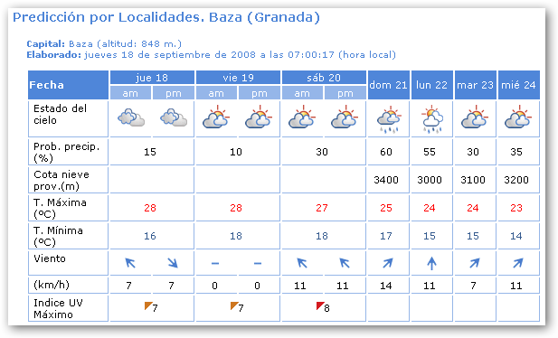 «Intervalos nubosos matinales en el litoral tendiendo por el día a poco nubosos; intervalos nubosos con nubosidad media y alta en el interior. Brumas en el litoral. Temperaturas nocturnas sin cambios; diurnas en ligero ascenso. Vientos flojos; variables en el Interior, y de componente este en el litoral, tendiendo a componente Oeste durante la tarde.