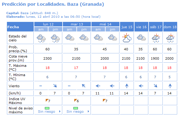 Aumento de la nubosidad hasta cielos nubosos a muy nubosos con chubascos localmente moderados, menos probables en la franja litoral, y que podrían ir ocasionalmente acompañados de tormentas en las sierras del nordeste. Brumas y posibles bancos de niebla matinales en puntos del interior. Temperaturas diurnas sin cambios o en ligero descenso. Vientos flojos variables tendiendo a componente oeste, con intervalos de intensidad moderada en el litoral por la tarde.