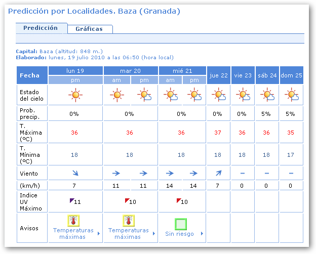 Cielos poco nubosos o despejados, con intervalos nubosos matinales en el litoral, y nubosidad de evolución en las sierras orientales. Brumas matinales costeras. Temperaturas sin cambios o en ligero ascenso. Vientos componente oeste flojos en el interior, y de componente este flojos en el litoral, tendiendo a variable al final.