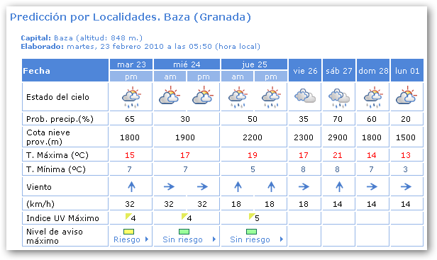 La cota de nieve se sitúa en 1800-2000 m. Temperaturas sin cambios o en ligero ascenso. Vientos de componente oeste moderados a fuertes, con rachas muy fuertes en el litoral y en zonas altas del interior.
