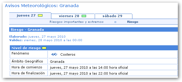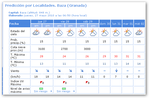 Poco nuboso con intervalos de nubes medias y altas, y nubosidad de evolución. Chubascos dispersos en el interior, más probables en las sierras, donde pueden ser localmente moderados e ir ocasionalmente acompañados de tormentas. Temperaturas sin cambios o en ligero descenso. Vientos de componente Oeste, flojos a moderados en el interior y moderados aumentando a fuertes en el litoral.