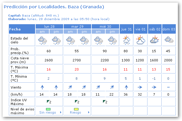 Cielos con intervalos de nubes medias y altas, aumentando a nubosos a muy nubosos con precipitaciones localmente moderadas en las comarcas del interior occidental y posibilidad de precipitaciones débiles en el resto. Temperaturas en ligero a moderado ascenso. Vientos de componente oeste moderados, con rachas fuertes en el litoral y cotas altas del interior.
