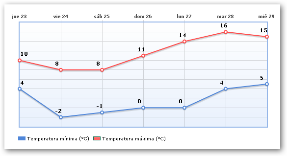 Temperaturas en descenso moderado. Vientos de componente oeste; moderados en el interior, con rachas fuertes en cotas altas, y fuertes en el litoral con rachas muy fuertes.