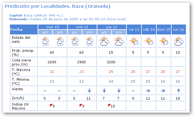 «Intervalos nubosos, aumentando por el día a nubosos, con probabilidad de chubascos débiles en el interior, ocasionalmente moderados y acompañados de tormentas en las comarcas del NE. Brumas matinales costeras. Temperaturas mínimas sin cambios o en ligero descenso, y máximas en ligero ascenso. Vientos variables flojos en el interior; de componente Este flojos a moderados en el litoral.