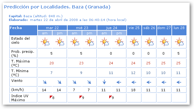 «Cielos poco nubosos con intervalos de nubes altas. Temperaturas en ligero a moderado ascenso, más acusado en el interior. Posibilidad de bancos de niebla matinales en el litoral. Vientos variables flojos en el interior, y de componente Este flojos a moderados en el litoral.