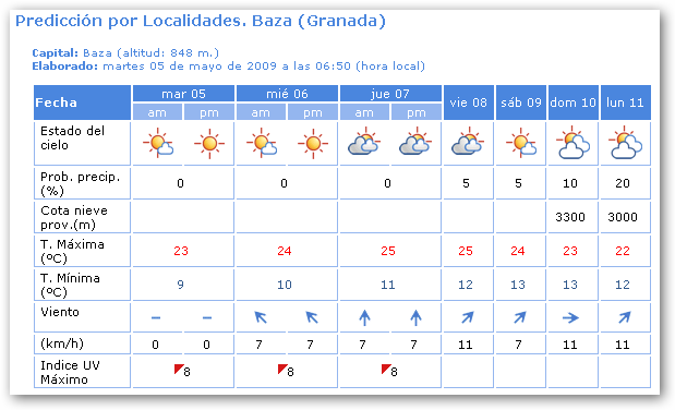 «Poco nuboso, con intervalos de nubes medias y altas, y nubosidad de evolución en las sierras. Temperaturas nocturnas sin cambios o en ligero ascenso, y diurnas sin cambios. Vientos flojos variables en el interior, y de componente este, flojos a moderados en el litoral alternando con brisas costeras.