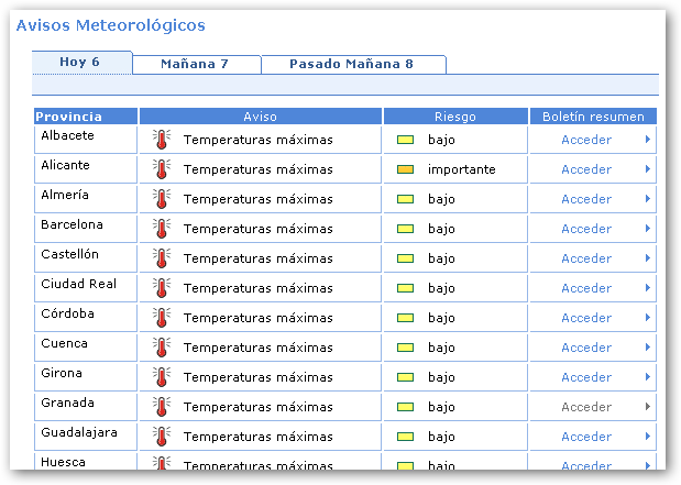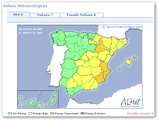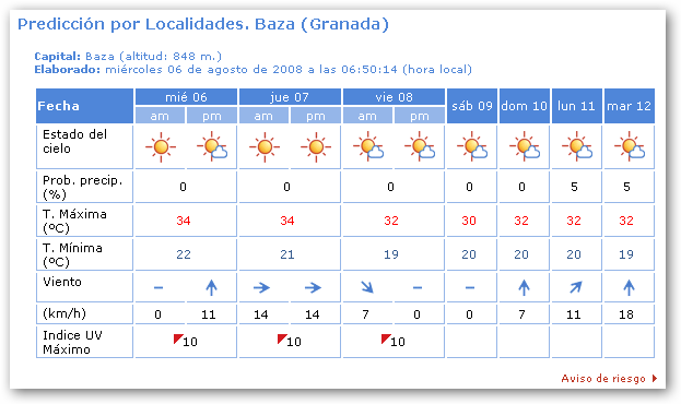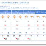 «Intervalos nubosos durante la mañana en el litoral; Poco nuboso o despejado en el resto, con nubosidad de evolución en las sierras nororientales, donde hay posibilidad de chubascos dispersos, que podrían ir acompañados de tormentas. Brumas matinales y probables nieblas en el litoral. Temperaturas sin cambios en el litoral, en ligero descenso en el interior. Vientos flojos variables, con régimen de brisas en la costa, tendiendo durante la tarde a componente Oeste, y aumentando a moderados en el litoral.