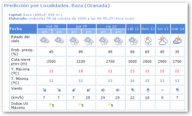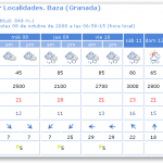 «Nuboso con chubascos, más probables en las sierras orientales a partir de la tarde donde pueden ser localmente fuerte y acompañados de tormentas. Temperaturas mínimas sin cambios y máximas en ligero a moderado descenso, más acusado en el Interior. Vientos de componente Oeste, flojos a moderados en el interior, rolando a componente Norte en el interior.