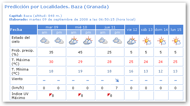 «Intervalos nubosos, con predominio de nubes medias y altas en el interior; probabilidad de chubascos localmente moderados y acompañados de tormentas, menos probables en el litoral. Temperaturas en ligero ascenso. Vientos variables flojos; tendiendo por la tarde en el litoral a componente Oeste, flojos a moderados.