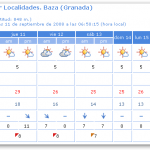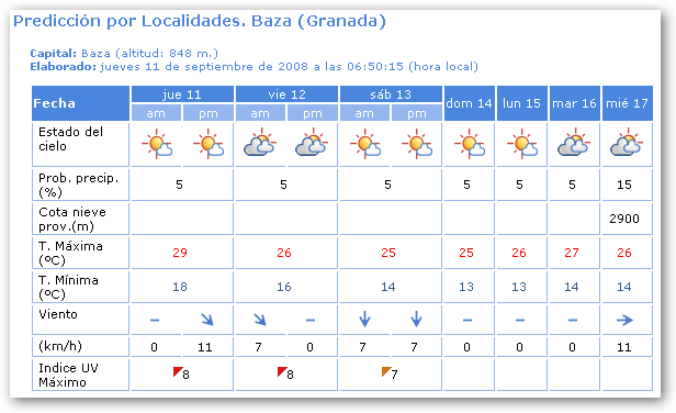 «Intervalos nubosos evolucionando a muy nuboso o cubierto en las horas centrales, con chubascos dispersos, de intensidad moderada en el interior, donde pueden ir ocasionalmente acompañados de tormentas y ser localmente fuertes en zonas montañosas. Temperaturas sin cambios o nocturnas en ligero descenso. Vientos de componente Oeste, flojos a moderados.