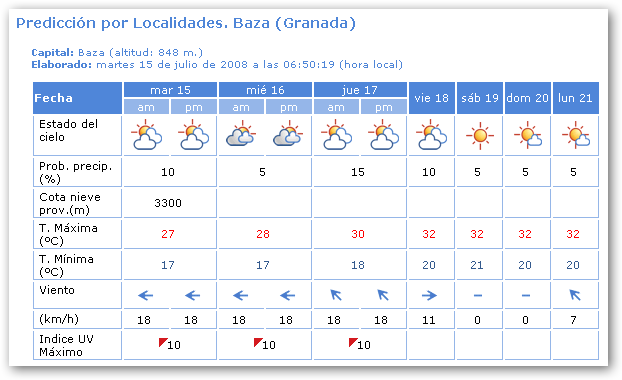 «Cielos poco nubosos; nubosidad de evolución diurna con chubascos débiles, que pueden ser localmente moderados y acompañados de tormenta. Temperaturas en ligero, o localmente moderado. Vientos de componente Este; flojos a moderados en el interior, y moderados a fuertes en el litoral.