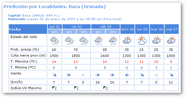 «Muy nuboso o cubierto, con precipitaciones débiles, localmente moderadas. Brumas matinales. Temperaturas sin cambios o en ligero descenso. Vientos de componente Oeste, flojos a moderados.