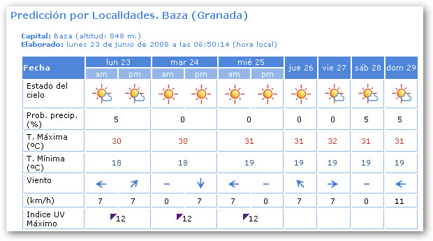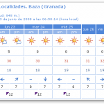 «Intervalos nubosos hacia las comarcas del Norte con probabilidad de chubascos localmente moderados y ocasionalmente acompañados de tormentas; Poco nuboso en el resto. Temperaturas mínimas sin cambios y diurnas sin cambios o en ligero descenso. Vientos variables flojos, predominando la componente Oeste, arreciando a moderados en el litoral.