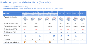 «Cielos nubosos a muy nubosos con chubascos débiles a moderados, ocasionalmente acompañados de tormetas, menos probables en el litoral. Temperaturas sin cambios o en libero descenso. Vientos de componente Oeste, flojos en el interior y moderados en el litoral.