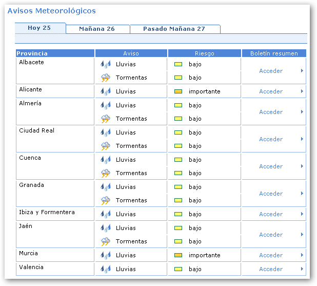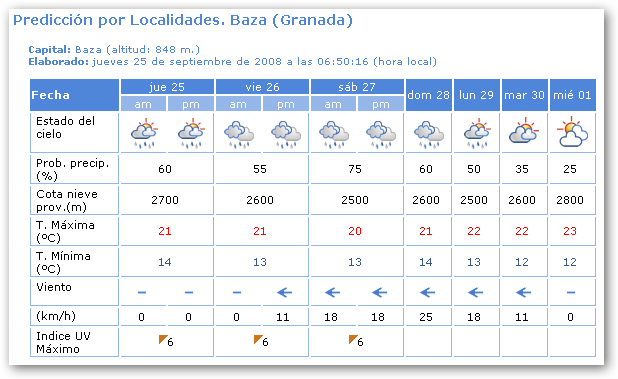«Nuboso a muy nuboso con chubascos moderados en la mitad oriental de la provincia, ocasionalmente acompañados de tormenta, y localmente fuertes, y débiles a moderados en el resto. Temperaturas en ligero descenso, o localmente moderado en el interior. Vientos variables flojos tendiendo durante la tarde en el litoral a componente Este, flojos.