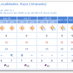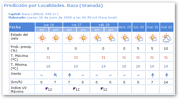 «Poco nuboso o despejado, salvo intervalos nubosos matinales en el litoral occidental, y nubosidad de evolución en las sierras. Temperaturas sin cambios o en ligero ascenso. Vientos variables flojos en el interior y de componente Este, flojos a moderados en el litoral.