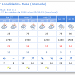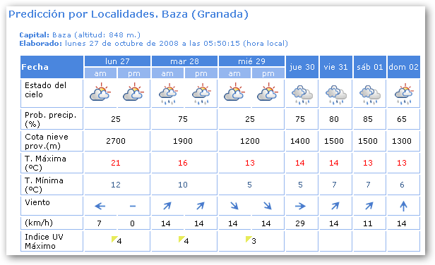 «Cielos con intervalos poco nubosos en el interior aumentando a intervalos nubosos por la tarde. Temperaturas mínimas en ligero descenso; máximas sin cambios. Vientos de componente Este, flojos en el interior; y girando en general a componente Oeste.