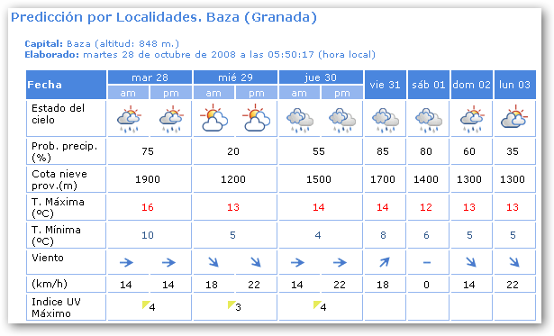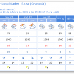 «Cielos nubososo a muy nubososo con precipitaciones débiles, localmente moderados y persistentes, en forma de nieve en cotas superiores a 1500 mts a últimas horas. Temperaturas en descenso, ligero las mínimas y moderado las máximas. Vientos de componente Oeste flojos, girando al final a Noroeste en el interior y arreciando a moderados.