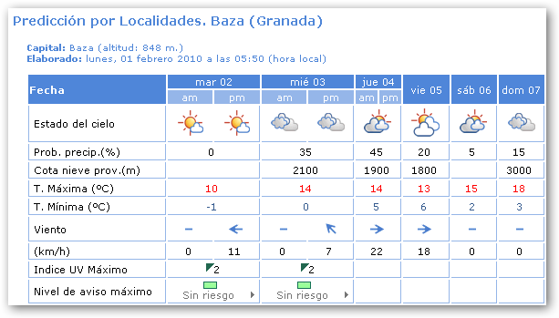 Poco nuboso. Brumas y posibles bancos de niebla matinales en puntos del interior. Temperaturas sin cambios, con heladas débiles en puntos del interior. Vientos de componente Este, flojos a moderados en el interior y moderados con intervalos de fuertes en el litoral.