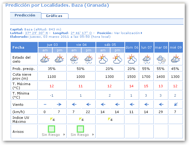 Cielos poco nubosos aparareciendo intervalos nubosos en el litoral y aumentando a cielos nubosos en el interior con posibilidad de precipitaciones débiles y dispersas, más probables en las sierras. La cota de nieve se situará alrededor de los 1000-1200 mts. Temperaturas diurnas sin cambios. Vientos variables flojos tendiendo al final del día a componete Este y aumentando en el litoral a moderados.