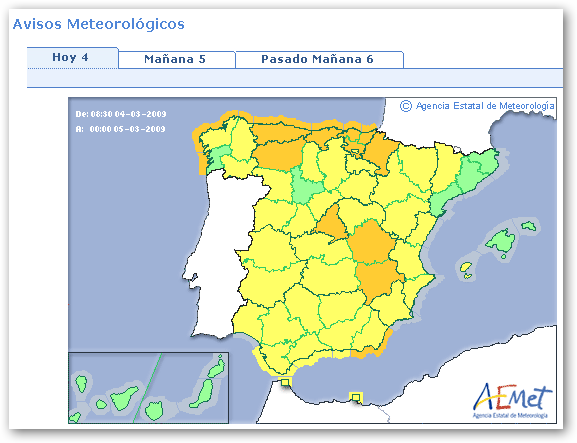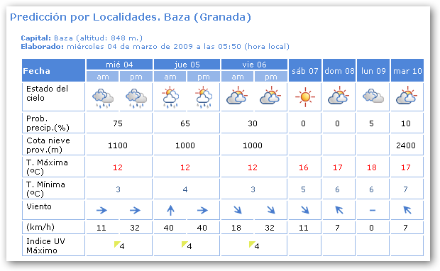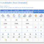 Nuboso a muy nuboso con precipitaciones débiles a moderadas, persistentes en las Sierras a partir de la tarde, menos probables en el litoral y extremo oriental. La cota de nieve se sitúa torno a 1200-1400m. Temperaturas mínimas en ligero descenso; máximas en ligero a moderado ascenso. Vientos del Oeste, moderados en el interior y fuertes en el litoral, con rachas de viento muy fuertes en el litoral y cotas altas del interior.
