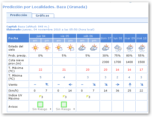 Cielos poco nubosos o despejados. Brumas matinales. Temperaturas en ligero ascenso, excepto en la franja litoral donde permaneceran sin cambios o descenderan ligeramente. Vientos de componente Este flojos aumentando a moderados en el litoral.