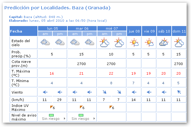 Nuboso con predominio de nubes medias y altas, y precipitaciones débiles dispersas a partir de la tarde. Temperaturas nocturnas sin cambios o en ligero ascenso, y diurnas sin cambios o en ligero descenso. Vientos de componente Este, flojos a moderados en el interior con rachas fuertes en cotas altas, y fuertes a muy fuertes en el litoral.