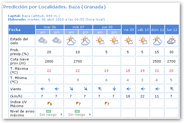 Cielos poco nubosos con intervalos de nubes altas, e intervalos de nubes bajas por la mañana en el litoral. Posibilidad de alguna precipitación débil y aislada en zonas de sierra a primeras horas. Temperaturas nocturnas en ligero ascenso; máximas en moderado a notable ascenso.Vientos de componente Este, flojos a moderados en el interior y fuertes en el litoral, disminuyendo durante la tarde.