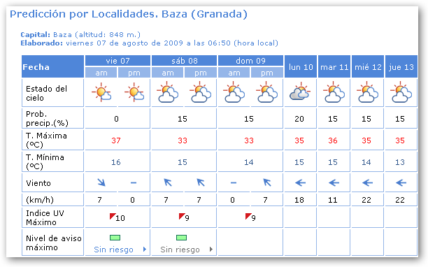 Poco nuboso con intervalos de nubes altas y nubosidad de evolución en las sierras orientales. Temperaturas nocturnas en ligero descenso, y diurnas sin cambios. Vientos de componente Oeste, flojos en el interior y flojos a moderados en litoral.