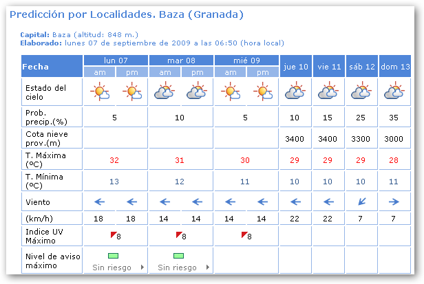 Intervalos de nubes bajas, más abundantes por la mañana, en el litoral, donde existe la posibilidad de alguna precipitación débil y dispersa; poco nuboso en el resto, con intervalos de nubes medias y altas; nubosidad de evolución en las sierras, existiendo la posibilidad de algún chubasco débil y aislado en el Sistema Penibético. Brumas costeras. Temperaturas sin cambios. Vientos de componente Este, flojos a moderados en el interior, y moderados a fuertes en el litoral.