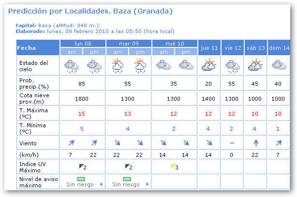 Cielos muy nubosos con precipitaciones débiles, localmente moderadas, y que podrían ser ocasionalmente tormentosas. Cota de nieve en descenso hasta los 1400 metros en el Norte y 1600 metros en el Sur. Posibilidad de nieblas matinales en zonas del interior. Temperaturas en ligero descenso. En el interior, vientos flojos a moderados de componente Oeste con rachas fuertes en cotas altas. En el litoral, vientos de componente Oeste moderados aumentando a fuertes a partir del mediodía.