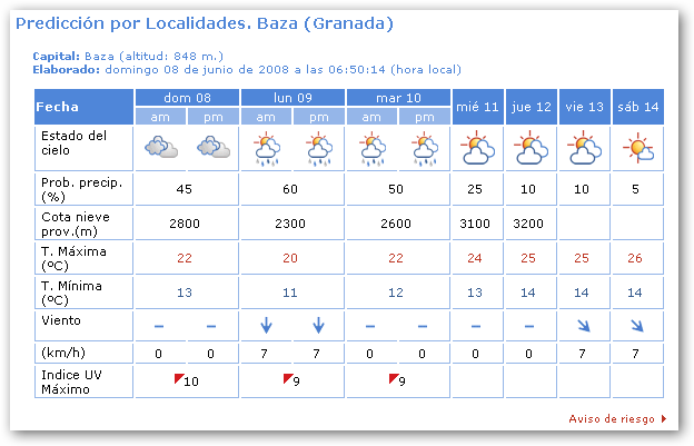 «Cielos poco nubosos aumentando a muy nubosos con chubascos débiles a moderados por la tarde en el interio, ocasionalmente acompañado de tormentas, que pueden ser localmente fuertes en las comarcas de Guadix y Baza. Brumas matinales costeras. Temperaturas en ligero descenso. Vientos flojos variables en el interior y de componente Este moderados en el litoral.