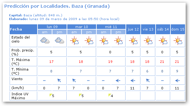 Intervalos nubosos matinales en el litoral; cielos poco nubosos en el resto con intervalos nubosos de tipo alto. Brumas matinales costeras y posibilidad de bancos de niebla matinales aislados en zonas bajas del interior. Temperaturas nocturnas en ligero descenso, y diurnas sin cambios. Vientos variables flojos en el interior, y de componente Este flojos en el litoral aumentando por el día a moderados.