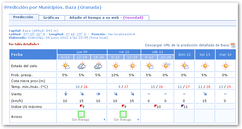 Poco nubuso o despejado con intervalos de nubes medias y altas durante la segunda mitad del día, más abundantes en el interior, existiendo la posibilidad de algún chubasco aislado en las sierras por la tarde. Temperaturas diurnas en ligero a moderado ascenso. Vientos de componente Oeste, flojos en el interior y moderados en el litoral.