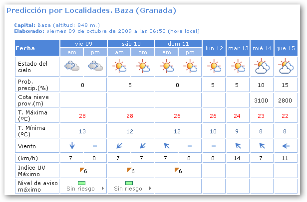 Poco nuboso con intervalos nubosos de tipo alto. Brumas matinales. Temperaturas sin cambios o en ligero ascenso. Vientos variables flojos, predominando la componente Oeste, en el interior y de componente Oeste flojos con intervalos moderados en el litoral.