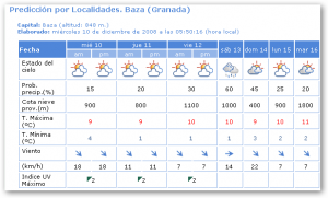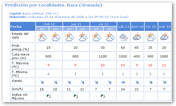 Nuboso tendiendo a lo largo de la mañana a poco nuboso, con posibilidad de precipitaciones débiles a primeras horas más probables en el extremo nororiental. La cota de nieve se sitúa entre 1000-800 metros. Temperaturas en moderado descenso, con mínimas al final del día en muchos puntos. Vientos de componente norte, moderados aumentando a fuertes en cotas altas del interior, y de componente Oeste moderados en el litoral con intervalos de fuertes en Melilla.