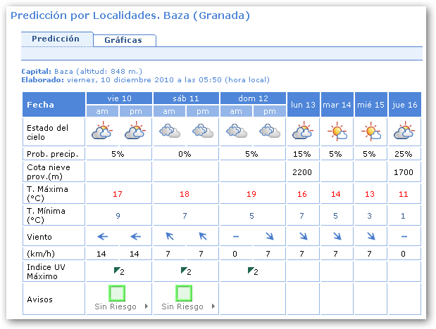 Nuboso de nubes bajas en el litoral con posibilidad de alguna precipitación débil y dispersa; intervalos nubosos con predominio de nubes altas en el resto. Brumas matinales en el interior. Temperaturas en ligero a moderado descenso. Vientos de componente Este, flojos a moderados en el interior y fuertes en el litoral.