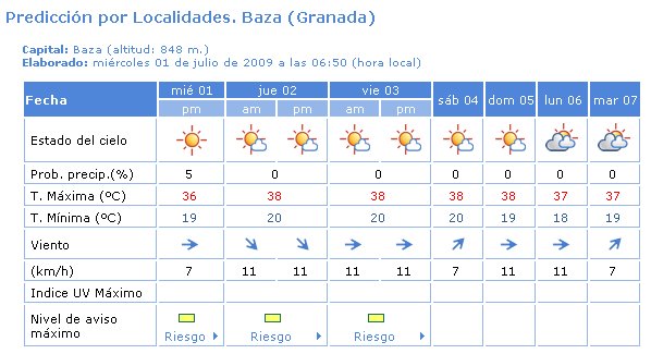 «Poco nuboso a despejado con nubosidad de evolución en las sierras orientales. Brumas y bancos de niebla costeros. Temperaturas en ligero ascenso, con máximas que alcanzarán los 38ºC en algunos puntos del interior. Vientos flojos variables en el interior tendiendo durante el día a componente oeste y régimen de brisas en el litoral»