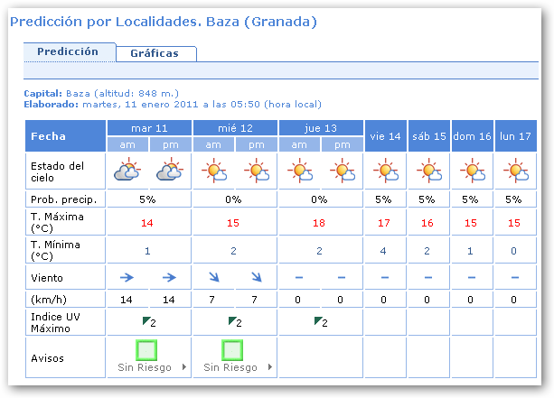 Intervalos nubosos en el interior, con posibilidad de precipitaciones débiles y dispersas en el Norte, de nieve por encima de 1600-1800 mts, tendiendo a poco nuboso durante la tarde. Poco nuboso en el litoral. Brumas y posibles bancos de niebla matinales en el interior. Temperaturas en ligero a moderado ascenso. Vientos de componente Oeste, flojos en el interior, y moderados en el litoral con intervalos de fuertes.