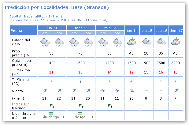 Nuboso a muy nuboso con precipitaciones localmente moderadas, tendiendo a disminuir la nubosidad y las precipitaciones a lo largo de la tarde. Cota de nieve en 900- 1300 metros subiendo a lo largo del día. Temperaturas en moderado a notable ascenso. Vientos flojos variables en el interior tendiendo a componente Oeste flojos a moderados; de componente Oeste en el litoral, moderados con intervalos de fuertes.