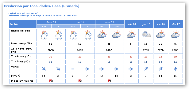 «Nuboso a muy nubuso, chubascos débiles, localmente moderados, y ocasionalmente acompañados de tormentas en las comarcas del interior oriental durante la tarde. Temperaturas en ligero ascenso. Vientos de componente oeste, flojos a moderados en el interior, y fuertes en el litoral.