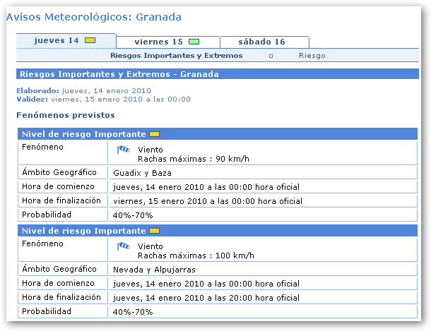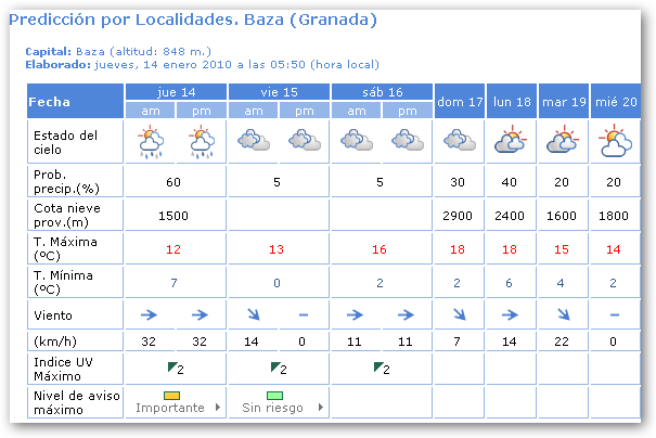 Cielos nubosos o muy nubosos con precipitaciones moderadas, tendiendo a disminuir la nubosidad y la precipitación. Temperaturas sin cambios. Vientos de componente Oeste moderados a fuertes con rachas de muy fuertes en cotas altas y fuertes con rachas de muy fuertes en el litoral.