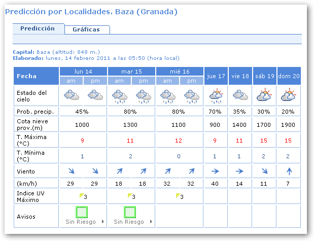 Cielos nubosos en el interior y occidental de la provincia y cielos poco nubosos en el litoral y comarcas orientales aumentando durante la tarde a nubosos o muy nubosos. Temperaturas en moderado descenso. Vientos de componente Oeste Noroeste; moderados en el interior con intervalos fuertes en cotas altas al principio, y fuertes en el litoral.