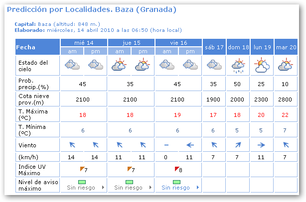 Cielos nubosos o muy nubosos con chubascos débiles y dispersos que pueden ser localmente moderados e ir acompañados de tormenta, tendiendo a generalizarse por el Oeste hacia el final del día. Temperaturas sin cambios. Vientos de componente Sur en el interior flojos a moderados; de componente Este moderados en el litoral aumentando a moderados a fuertes al final.
