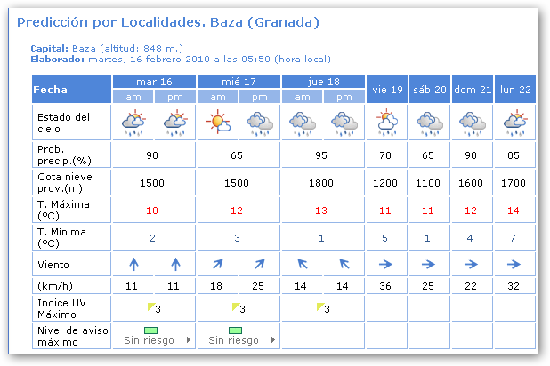 Cielos muy nubosos o cubiertos con precipitaciones moderadas. Cota de nieve superior a 1500 metros al principio. Temperaturas en ligero a moderado ascenso. En el interior, vientos flojos a moderados de componente Sur, con rachas fuertes en cotas altas. En el litoral vientos moderados del Este rolando a moderados del Oeste a partir de mediodía.