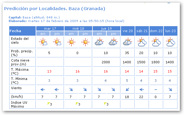 Cielos nubosos en el litoral tendiendo a poco nubosos durante la tarde; cielos poco nubosos o despejados en el resto. Probables bancos de niebla matinales en la cuenca del Genil. Temperaturas sin cambios, con heladas débiles nocturnas. Vientos variables flojos en el interior; de componente Este moderados en el litoral disminuyendo a flojos a última hora.