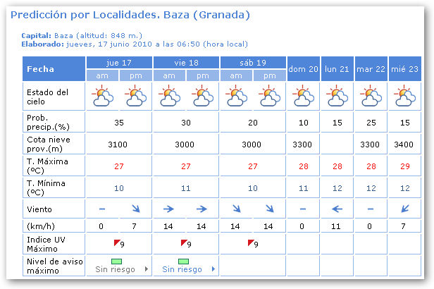 Cielos poco nubosos con intervalos de nubes bajas por la mañana en el litoral, y nubosidad de evolución durante el día en el interior, existiendo la posibilidad de algún chubasco débil y disperso en el área del sistema penibético. Temperaturas diurnas en ligero ascenso. Vientos en general flojos, siendo de dirección variable en el interior y en regimen de brisas con predominio de la componente Este en el litoral.